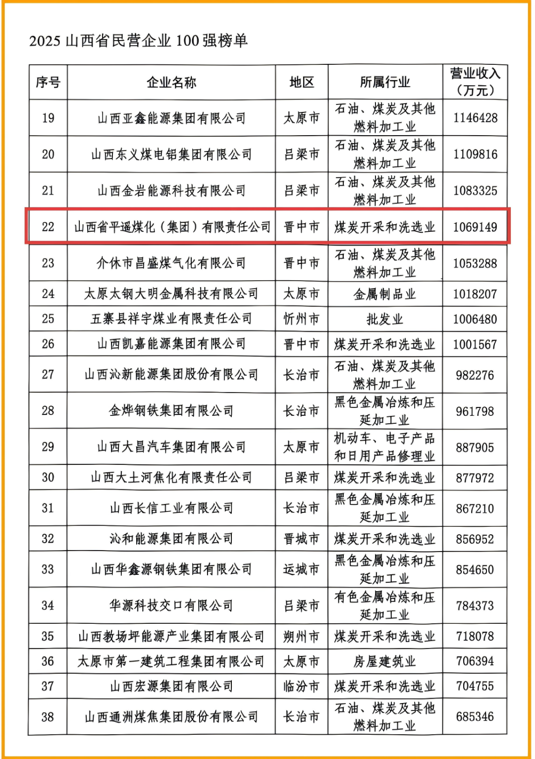9月18日,山西省工商聯發布“2025山西省民營企業100強”榜單,平遙煤化集團憑借雄厚的經濟實力與強勁的發展勢頭再度登榜,位列第22位。
